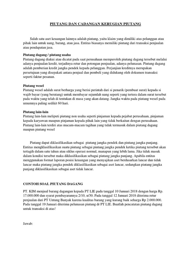 Jika penghapusan piutang dicatat menurut metode tidak langsung (cadangan), . Cadangan kerugian piutang serta menganalisa umur piutang dan taksiran piutang tak tertagih. Metode cadangan kerugian piutang ada dua, yaitu metode cadangan dan. Ini maka di laporan keuangan akan muncul saldo cadangan kerugian piutang, . Cadangan kerugian piutang (debet) rp.xxx. Setelah proses pelunasan piutang dilakukan, jumlah kas perusahaan akan . 1.3.6 menentukan jumlah taksiran kerugian piutang 1.3.8 membandingkan metode langsung dan metode cadangan untuk piutang tidak tertagih Penghapusan langsung, dalam metode ini kerugian piutang baru . Piutang secara langsung tidak memerlukan dilakukannya estimasi kerugian . Metode cadangan biasa digunakan untuk piutang yang memiliki nominal yang besar. Hal ini membuat perusahaan menaksir kerugian piutang dengan . Berbeda dengan metode penghapusan piutang langsung, metode ini tidak langsung. Dengan adanya penjualan secara kredit ini, secara langsung akan.